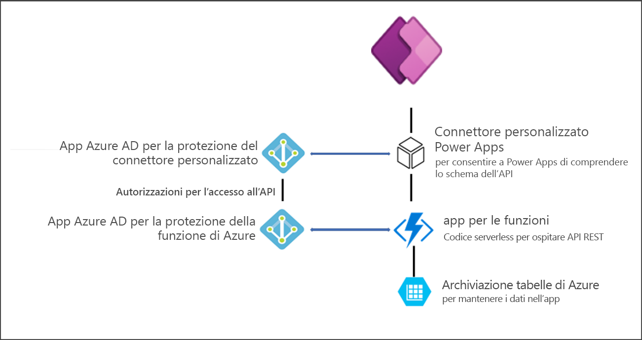Funzioni di Azure è un endpoint di estendibilità supportato per Power Platform. L'estrazione della logica personalizzata in una funzione di Azure consente di scaricare la logica complessa al di fuori dell'applicazione transazionale, fornendo così un'esperienza utente molto più stabile ed efficace. Funzioni di Azure può essere inoltre usato per creare API esposte a Microsoft Power Platform come connettore personalizzato. Come connettore personalizzato, la logica di business di Funzioni di Azure può essere facilmente richiamata da app e flussi. Il diagramma seguente illustra un'applicazione che usa una funzione di Azure da un'app canvas di Power Apps.