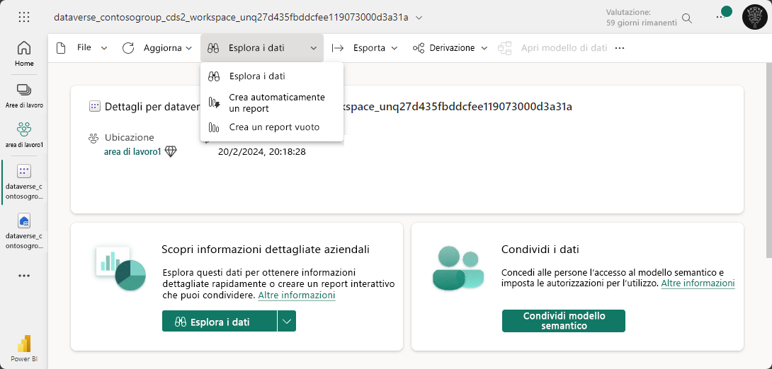 È possibile usare il modello semantico predefinito per creare report mediante Power BI. È possibile accedervi selezionando il modello semantico predefinito nell'area di lavoro. Il sistema fornisce opzioni per esplorare i dati, creare un report dall'inizio, creare automaticamente un report e creare un report impaginato dal modello semantico. Gli analisti di dati possono esplorare i dati e quindi creare report di loro scelta usando un'interfaccia visiva.