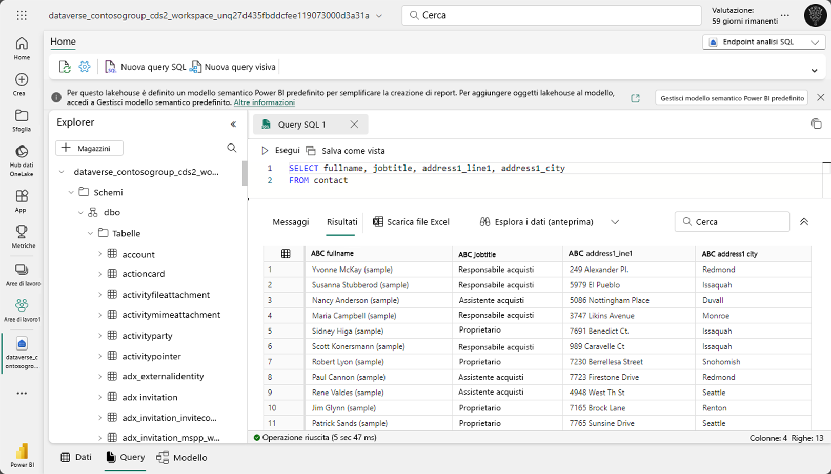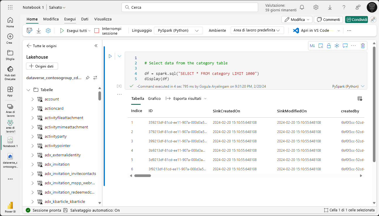 L'endpoint di Analisi SQL permette di scrivere query usando Transact-SQL (T-SQL). È possibile accedervi selezionando l'endpoint Analisi SQL nell'area di lavoro. Gli analisti di dati possono scrivere query per i report combinando i dati provenienti da Dataverse e da altre origini archiviati su Fabric.