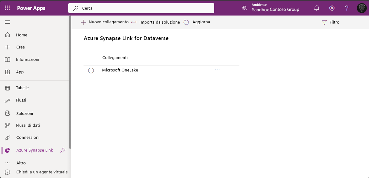 Dataverse gestisce le tabelle che si collegano a Fabric. È possibile gestire gli ambienti collegati in Dataverse usando la pagina Azure Synapse Link in Power Apps. Per accedere alla pagina dal riquadro di spostamento Tabelle, selezionare Analizza > Collegamento ad Azure Synapse nella barra dei comandi.