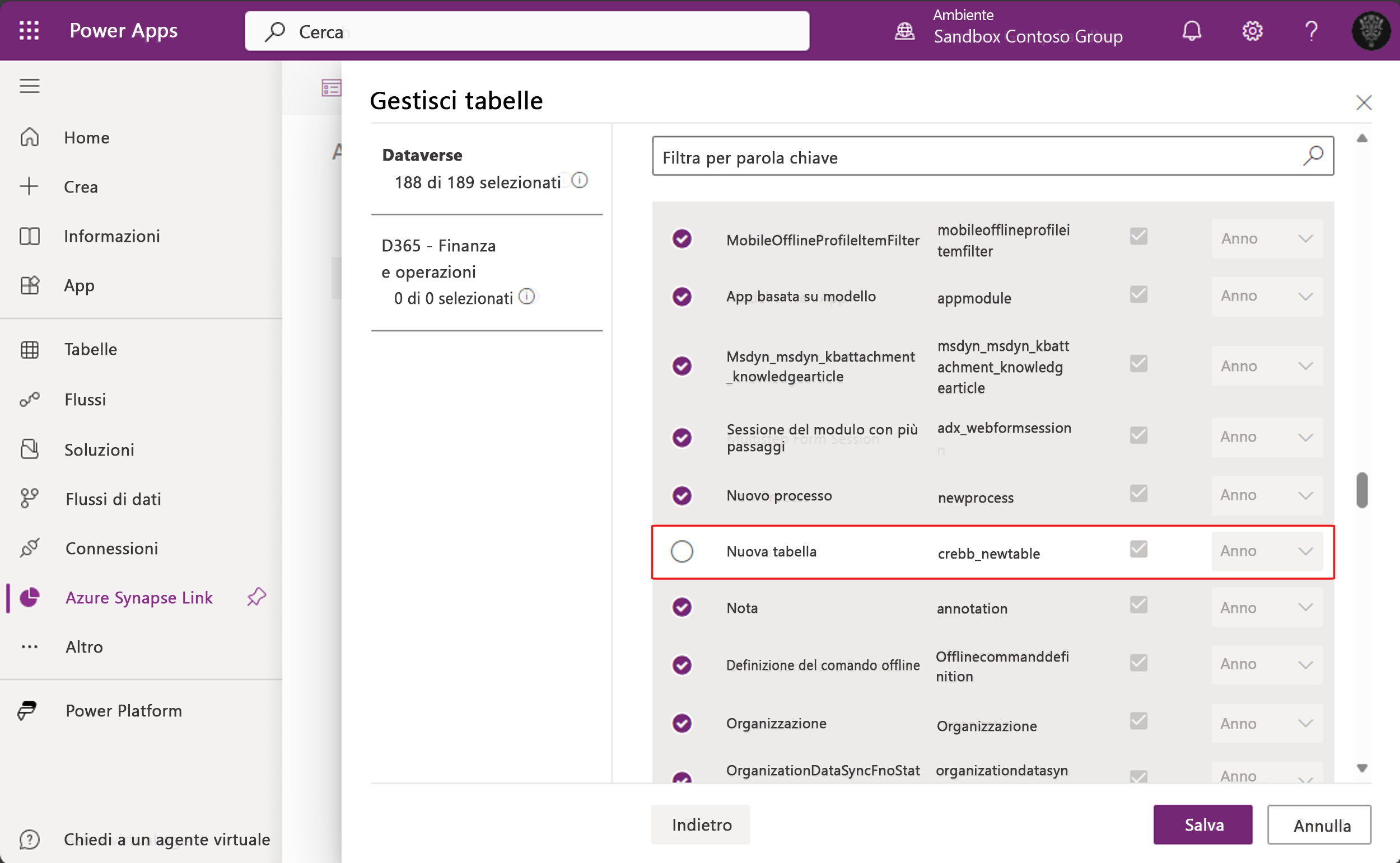 Dopo aver impostato il collegamento, occorre collegare manualmente tutte le nuove tabelle aggiunte a Dataverse. Questo parametro si applica anche alle tabelle per le quali la proprietà Track changes è stata attivata dopo l'impostazione iniziale del collegamento.