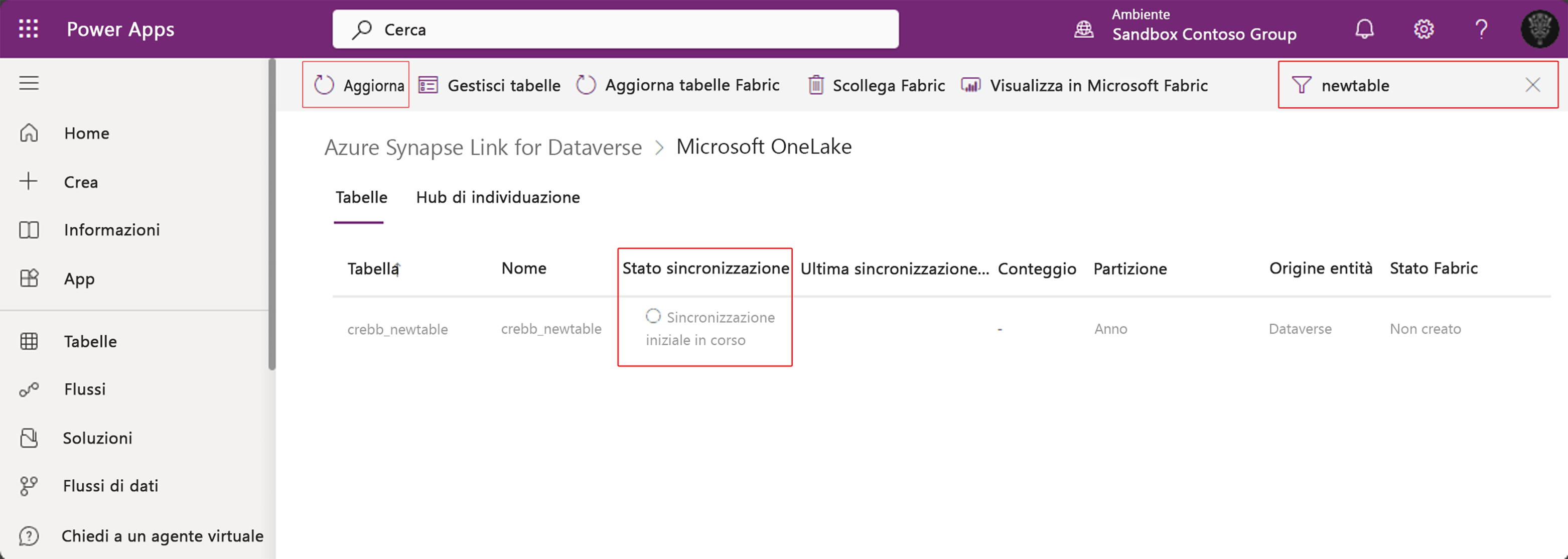 Se si eliminano delle tabelle collegate dal lakehouse, è possibile ricreare i collegamenti selezionando Aggiorna tabelle Fabric nella pagina Azure Synapse Link in Dataverse.