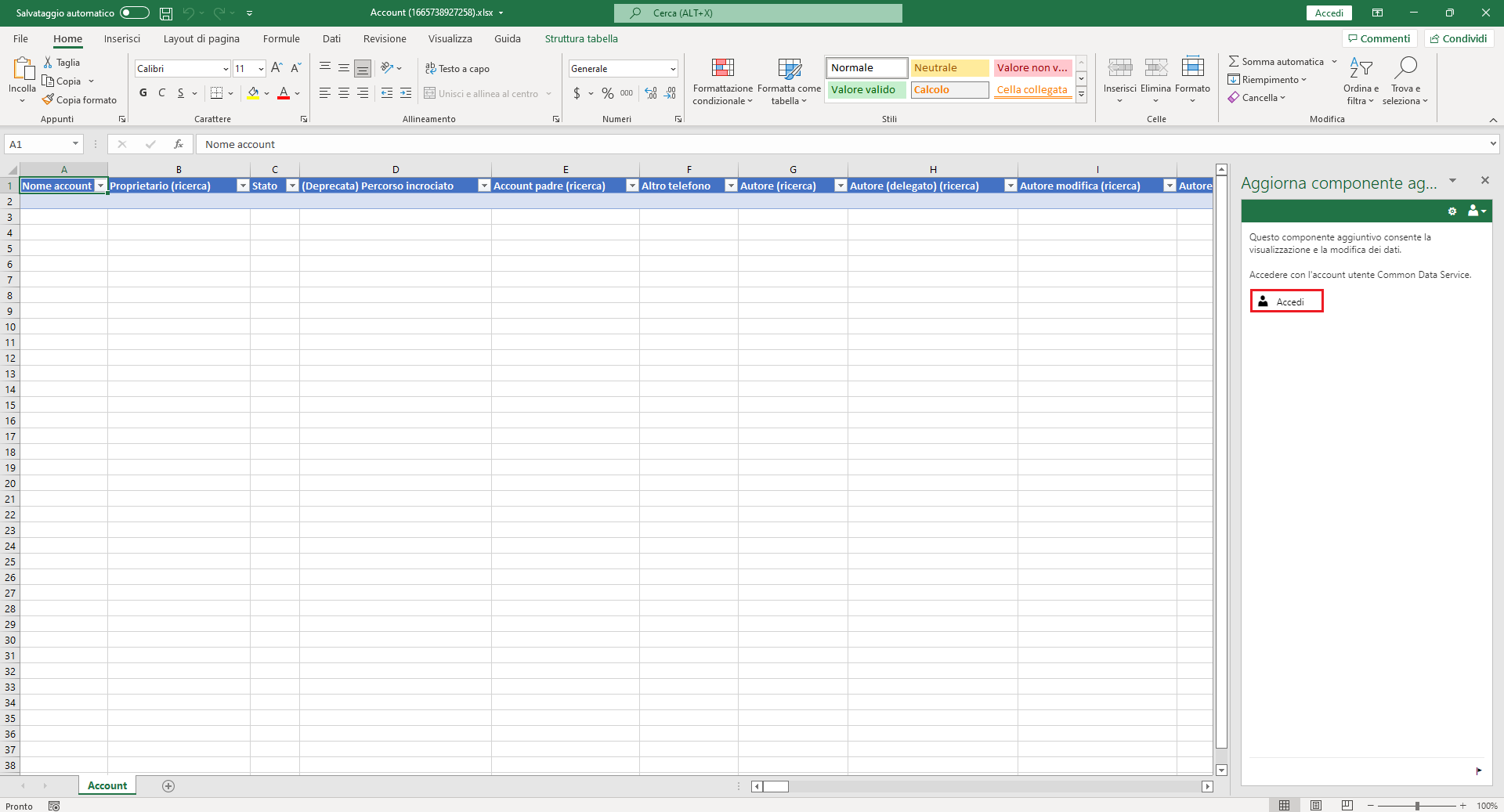 Se viene visualizzato un messaggio di errore, accertarsi di aver effettuato l'accesso usando lo stesso account connesso all'ambiente in cui si è scaricata la tabella Dataverse. Se così non è, disconnettersi e accedere nuovamente come utente corretto. Il messaggio di errore scompare.