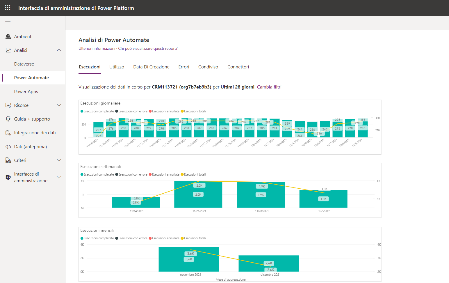 Il report Esecuzioni della funzionalità Analisi di Power Automate permette agli amministratori di determinare il numero di esecuzioni del flusso all'interno dell'ambiente su base giornaliera, settimanale e mensile. Grazie ai filtri dei dati di Power BI incorporato, un amministratore può inoltre filtrare i dati in base all'esecuzione riuscita, non riuscita o annullata.