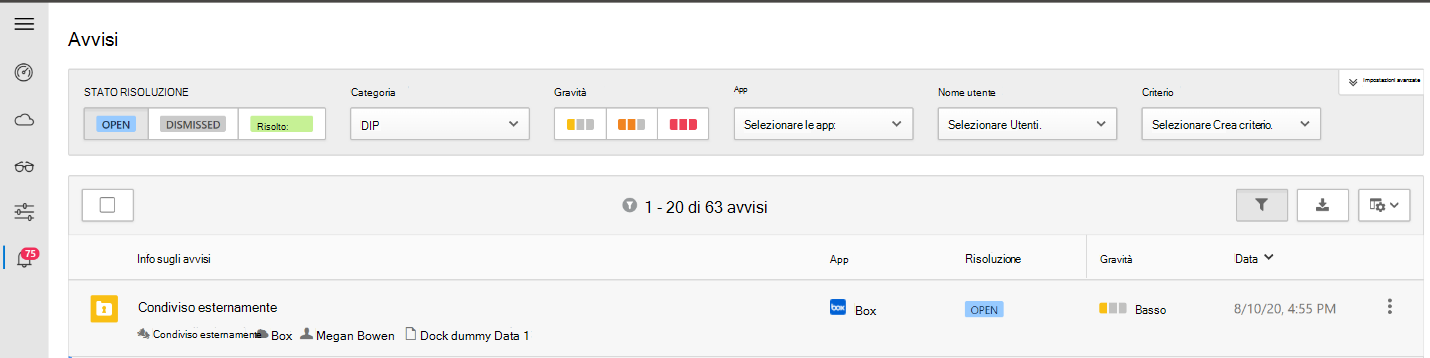 Controllare la dashboard per monitorare la presenza di avvisi e l'integrità generale dell'ambiente. Ad esempio, per esaminare gli avvisi correlati ai file, andare al riquadro Avvisi e selezionare DLP nel campo Categoria.