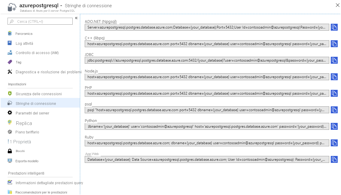 Le informazioni di connessione per il servizio Database di Azure per PostgreSQL sono disponibili nel portale di Azure nella pagina Stringhe di connessione per il servizio. Azure fornisce le informazioni per molti framework e linguaggi di programmazione comuni.