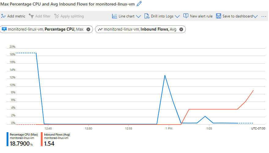 Si vuole esaminare il modo in cui il flusso del traffico nella macchina virtuale influisce sulla funzionalità della CPU. Se i grafici delle metriche predefiniti per una macchina virtuale non mostrano già i dati necessari, è possibile usare Esplora metriche per creare grafici delle metriche personalizzati. In questa unità viene tracciato un grafico che visualizza la CPU massima percentuale della macchina virtuale e i dati medi del flusso in ingresso insieme.