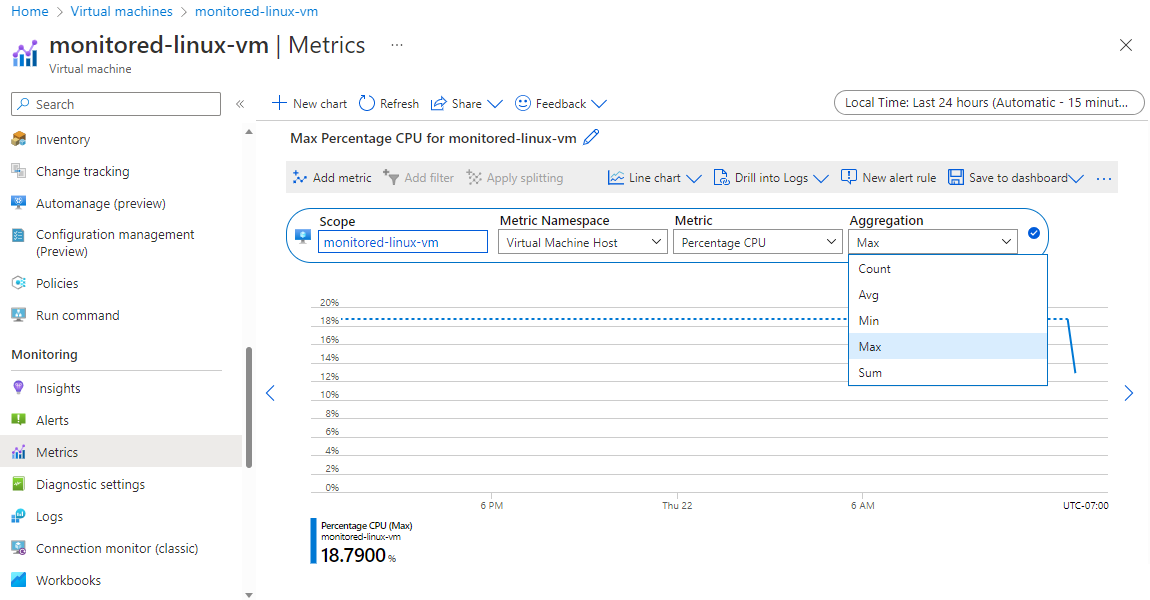 - Selezionare Metriche dal menu di spostamento a sinistra della macchina virtuale in Monitoraggio.