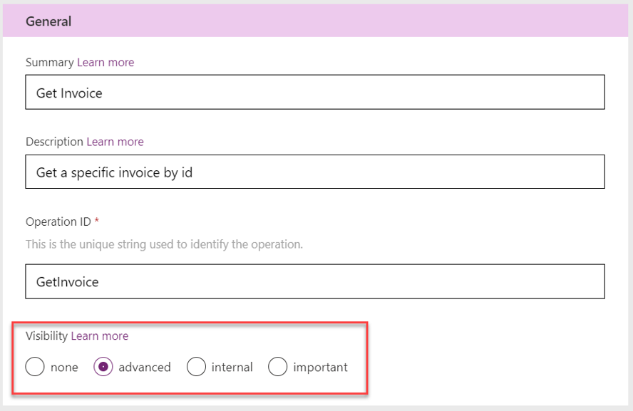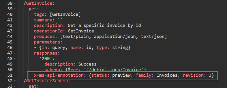 Usando la configurazione OpenAPI è possibile annotare le azioni sul connettore in modo che trasmetta l'uso previsto quando viene presentato nell'area di progettazione. Se si aggiunge ad esempio l'estensione OpenAPI x-ms-api-annotation all'azione GetInvoice, viene specificato lo stato di anteprima.