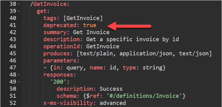 Per nascondere l'azione ai nuovi utenti, senza però nasconderla agli utenti esistenti, è possibile contrassegnarla come deprecata nella configurazione OpenAPI. Per apportare questa modifica si può intervenire direttamente sulla definizione OpenAPI tramite l'editor Swagger. Per indicare che un'azione è deprecata, aggiungere il seguente comando alla configurazione dell'operazione: