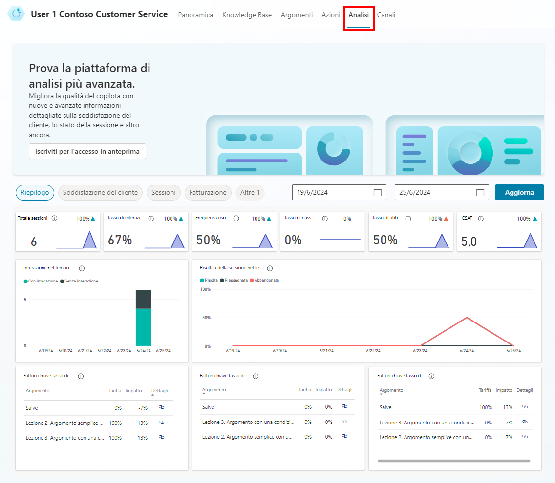 Analisi: fornisce metriche per monitorare le prestazioni dell'agente. Le varie sezioni di Analisi includono: Panoramica, Efficacia, Utilizzo e Soddisfazione.