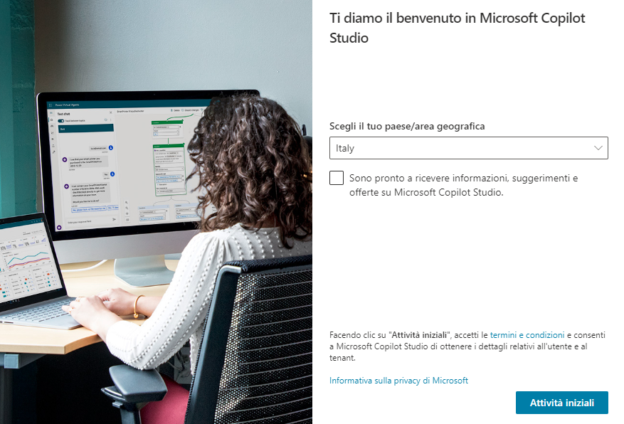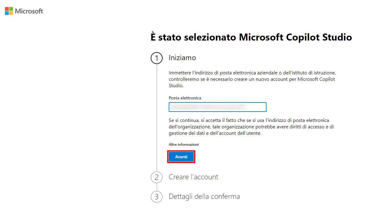 Andare a https://copilotstudio.microsoft.com/ e digitare l'indirizzo e-mail che si userà per creare l'agente. Accedere con l'account aziendale, dell'istituto di istruzione o per sviluppatore se non si lavora con un istruttore.