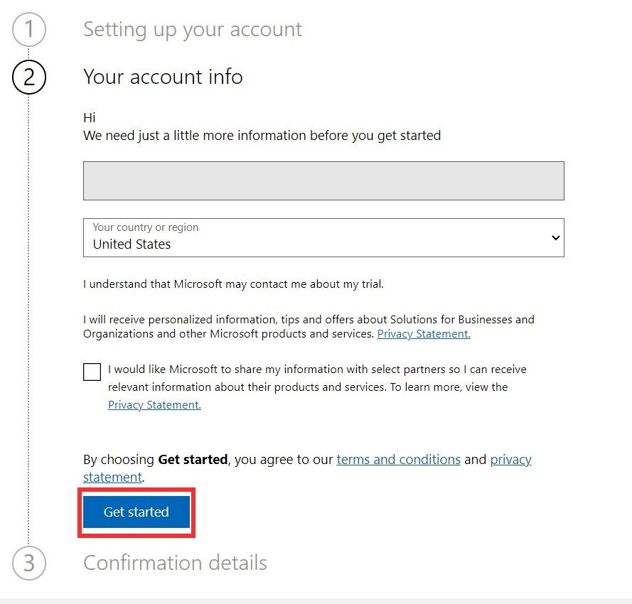 Scegliere il paese/area geografica, quindi selezionare Avvia la versione di valutazione gratuita.