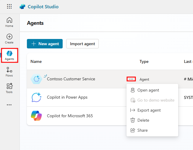 All'interno del menu Agenti è possibile scegliere tra gli agenti disponibili. Selezionando i puntini di sospensione accanto a un agente si apre un menu a discesa con controlli che permettono, tra le altre cose, di aprire, esportare ed eliminare l'agente. È anche possibile selezionare il nome dell'agente per aprirlo.