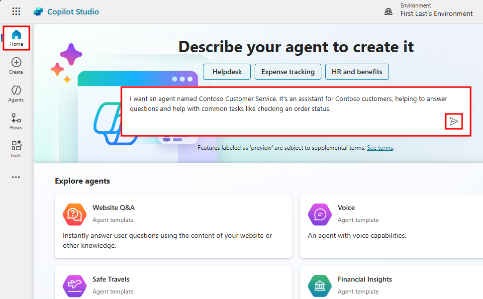 Nella pagina Microsoft Copilot Studio Homedescrivere l'agente per crearlo. Inserire una descrizione come la seguente: