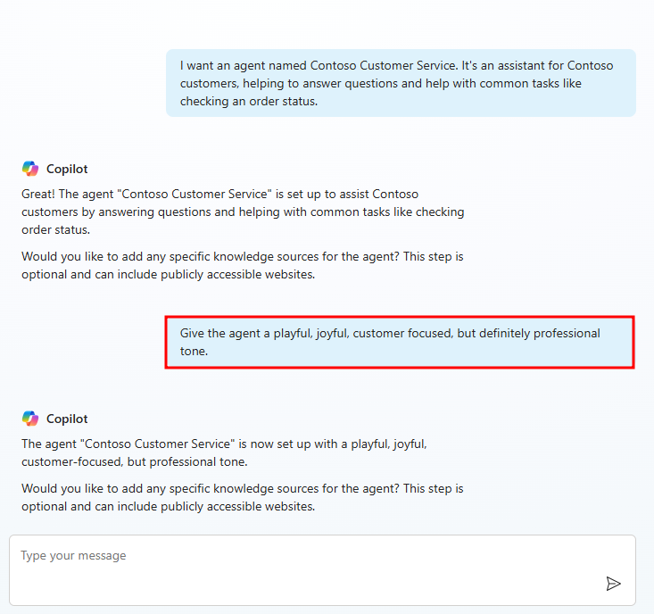Iniziare aggiungendo un tono di voce all'agente. Digitare la richiesta seguente nella finestra della chat: