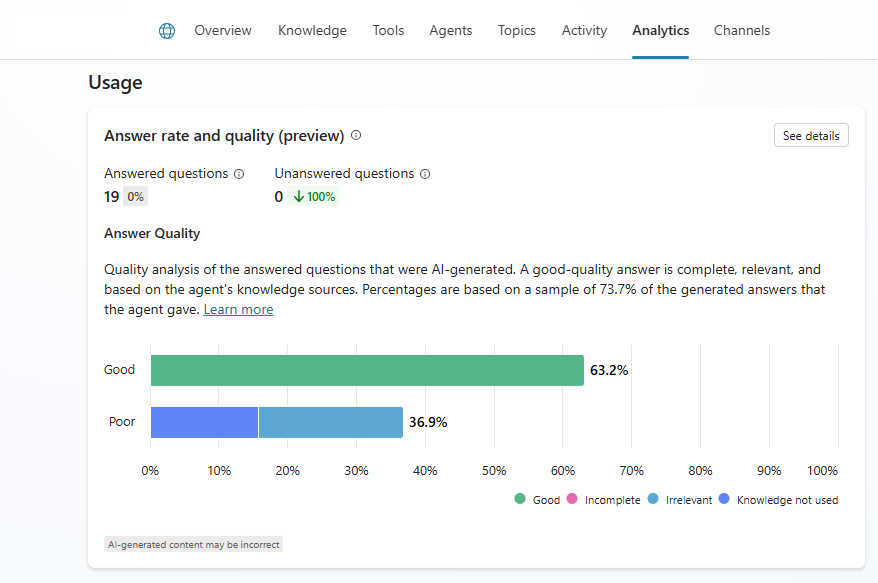 Percentuale e qualità delle risposte: prestazioni dell'agente nel rispondere alle domande degli utenti. Include la percentuale di risposte alle domande e la qualità delle risposte generate dall'IA. Il grafico di qualità delle risposte si suddivide in due indicatori di qualità della risposta: Buona e Scarsa.