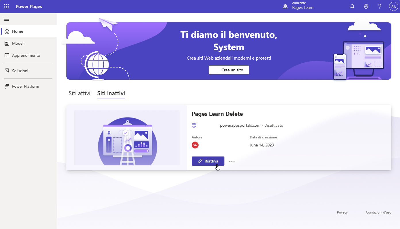 Per attivare il sito Web di cui si è eseguita la migrazione, nella schermata Home di Power Pages nell'ambiente di destinazione selezionare la scheda Siti inattivi, selezionare Riattiva per il sito Web di destinazione, quindi specificare il nome del nuovo sito Web e un nuovo indirizzo Web quando richiesto.