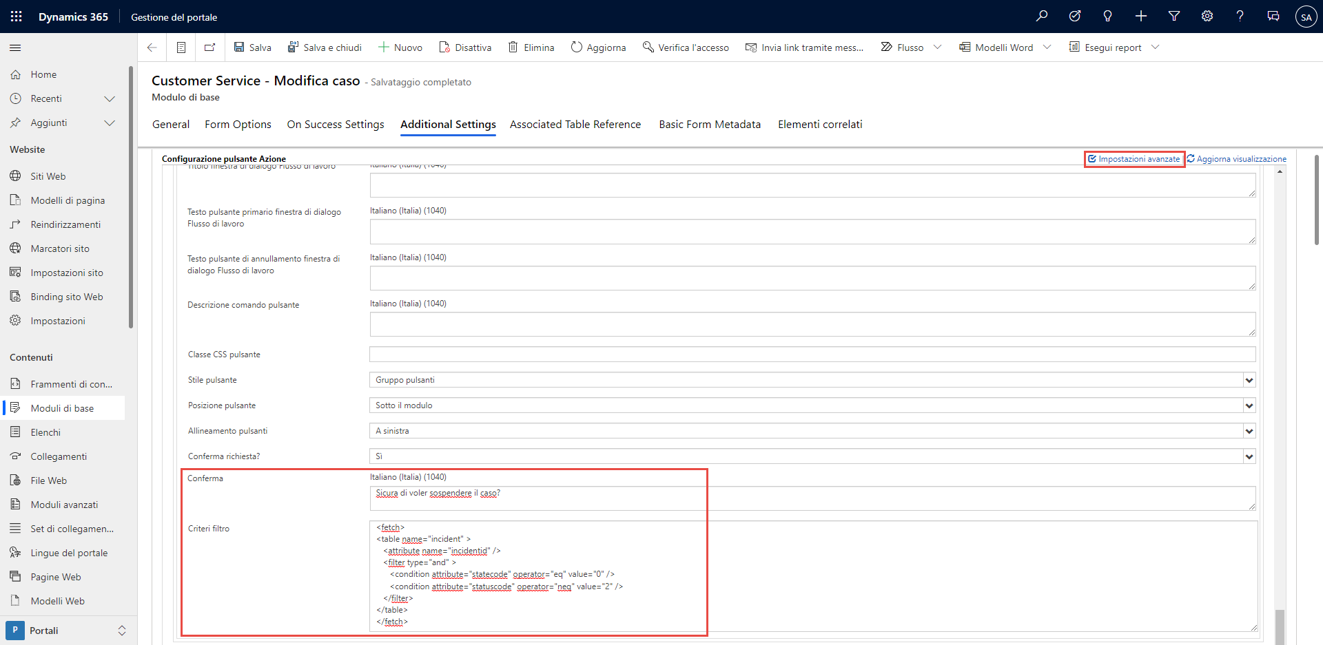 <fetch> <table name="incident" > <attribute name="incidentid" /> <filter type="and" > <condition attribute="statecode" operator="eq" value="0" /> <condition attribute="statuscode" operator="neq" value="2" /> </filter> </table> </fetch>Questo codice FetchXML assicura che il pulsante sia visibile solo quando il caso è attivo (