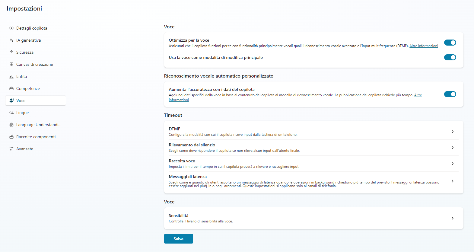 È necessario eseguire una configurazione per impostare le funzionalità vocali dell'agente. Tutte le impostazioni vocali sono disponibili accedendo a Impostazioni>Voce. Inizialmente l'agente non è ottimizzato per l'uso delle funzionalità vocali. Se si seleziona Ottimizza per la voce, diventano disponibili altre funzionalità vocali.