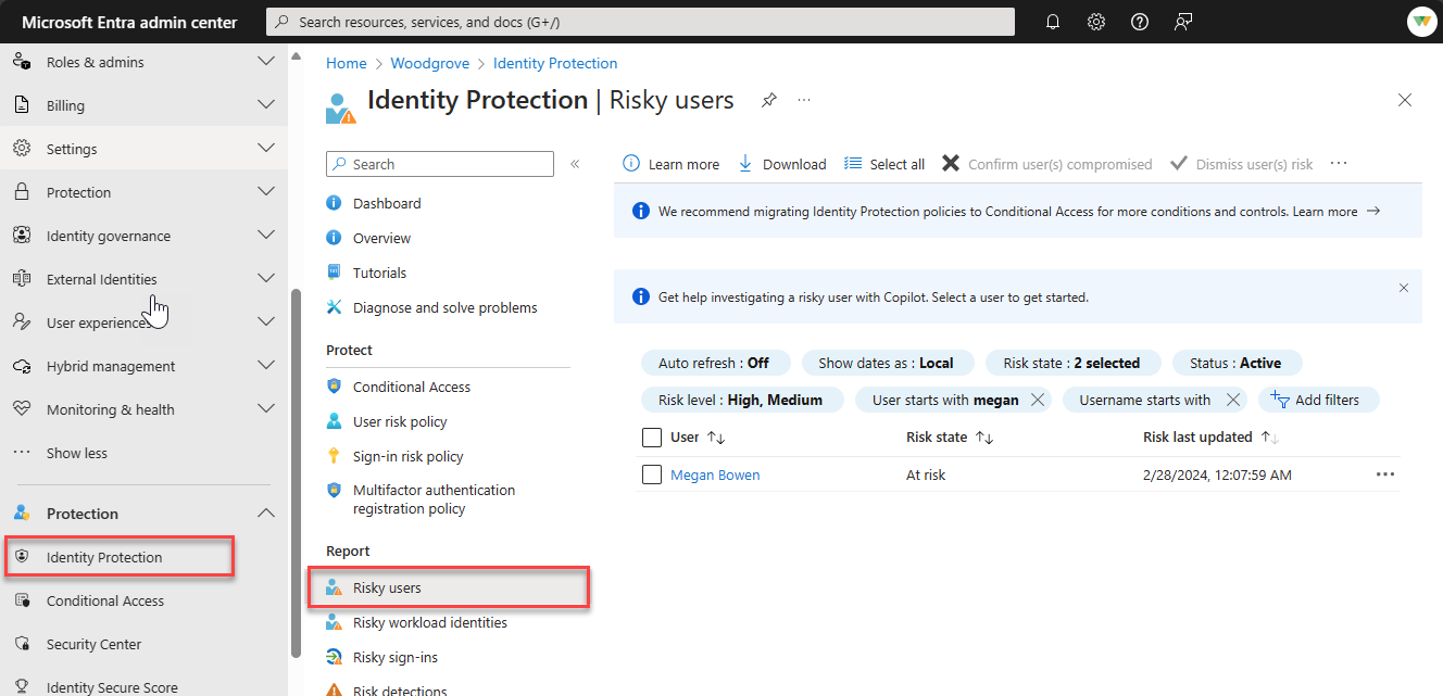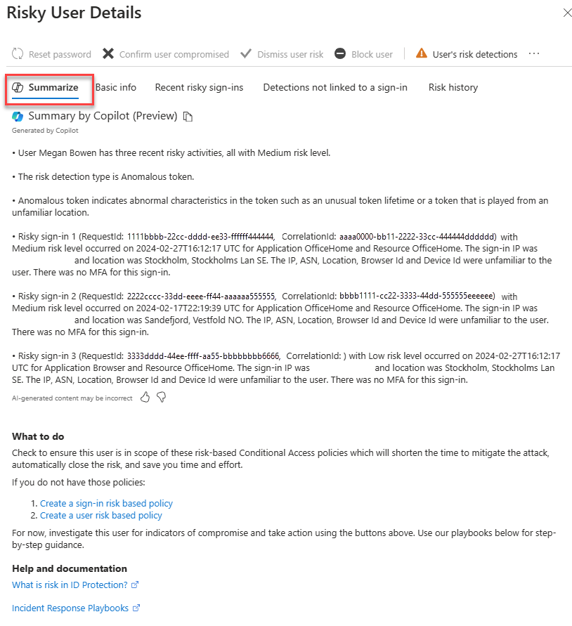 - Riepilogo di Copilot: riepiloga in linguaggio naturale perché il livello di rischio utente è stato elevato.