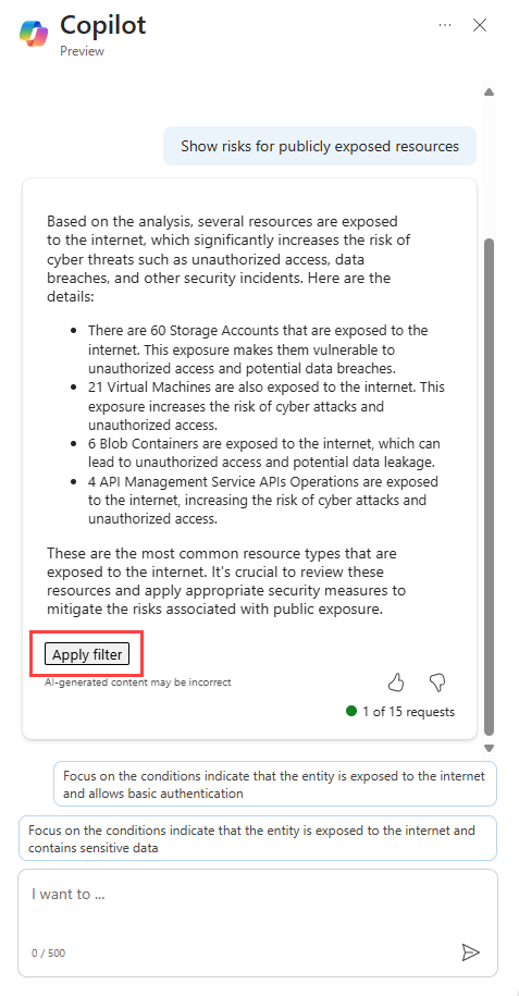 Copilot genera un'analisi iniziale ed è possibile filtrare l'elenco di raccomandazioni in base alla suddetta. È possibile perfezionare ulteriormente i risultati selezionando una delle richieste di completamento suggerite o immettendone una manualmente e applicando il filtro.