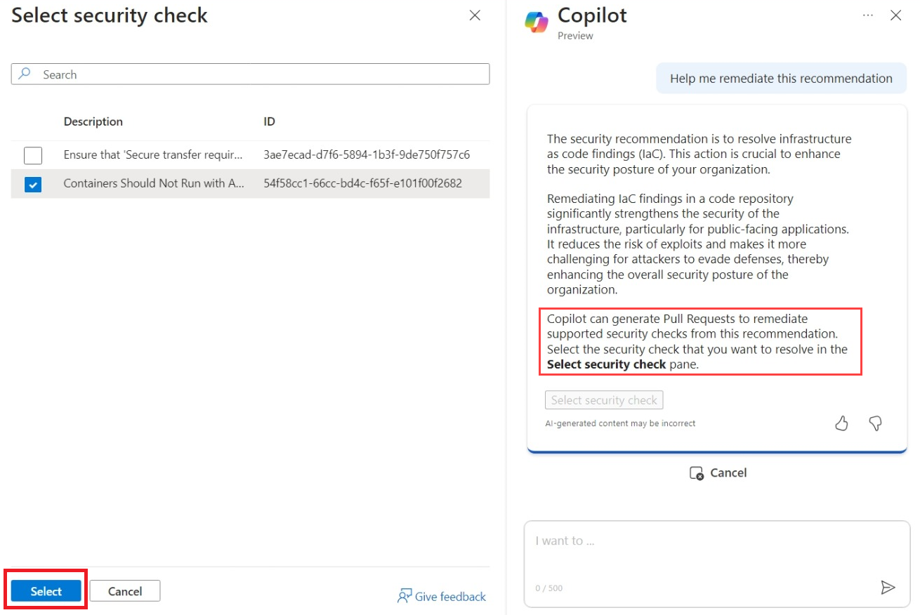 Selezionando "Seleziona controllo di sicurezza", Copilot può generare richieste pull per correggere i controlli di sicurezza supportati dalla raccomandazione.