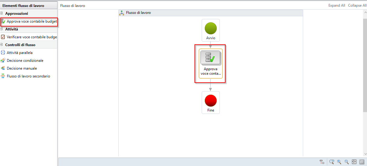 Nel riquadro Elementi flusso di lavoro selezionare il componente Approvazione della voce di registro budget, trascinarlo nel riquadro del flusso di lavoro e connetterlo al connettore Inizio e Fine.