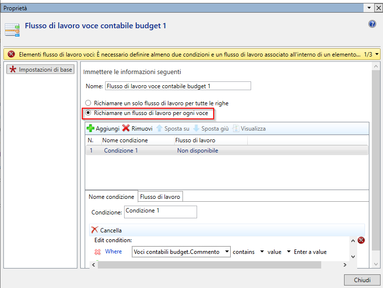 Configurare le impostazioni di base per Flusso di lavoro voce contabile budget, che include due opzioni: