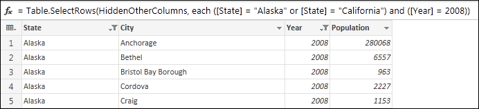 Filtrando più colonne è possibile usare criteri più complessi. Questo approccio prevede l'uso della funzione Select Rows.