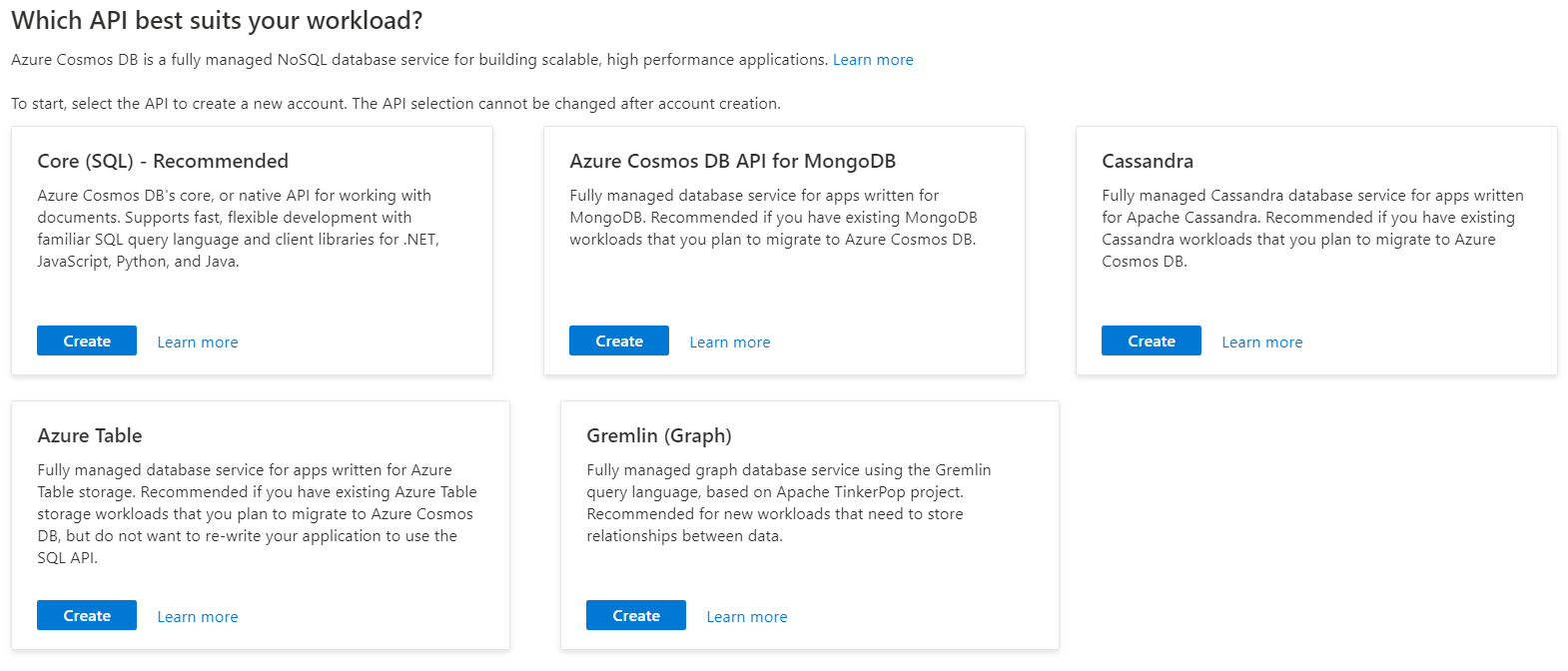 Quando si crea un nuovo account nel portale, è prima necessario selezionare un'API per il carico di lavoro. La selezione dell'API non può essere modificata dopo la creazione dell'account. Per la parte restante di questa sezione, si presuppone che l'API NoSQL sia stata selezionata.
