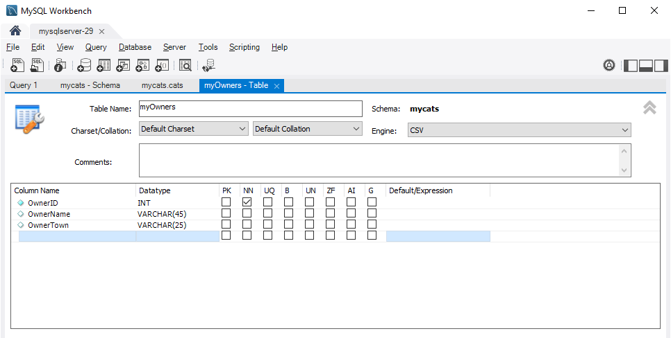 CREATE TABLE `mycats`.`myowners` (