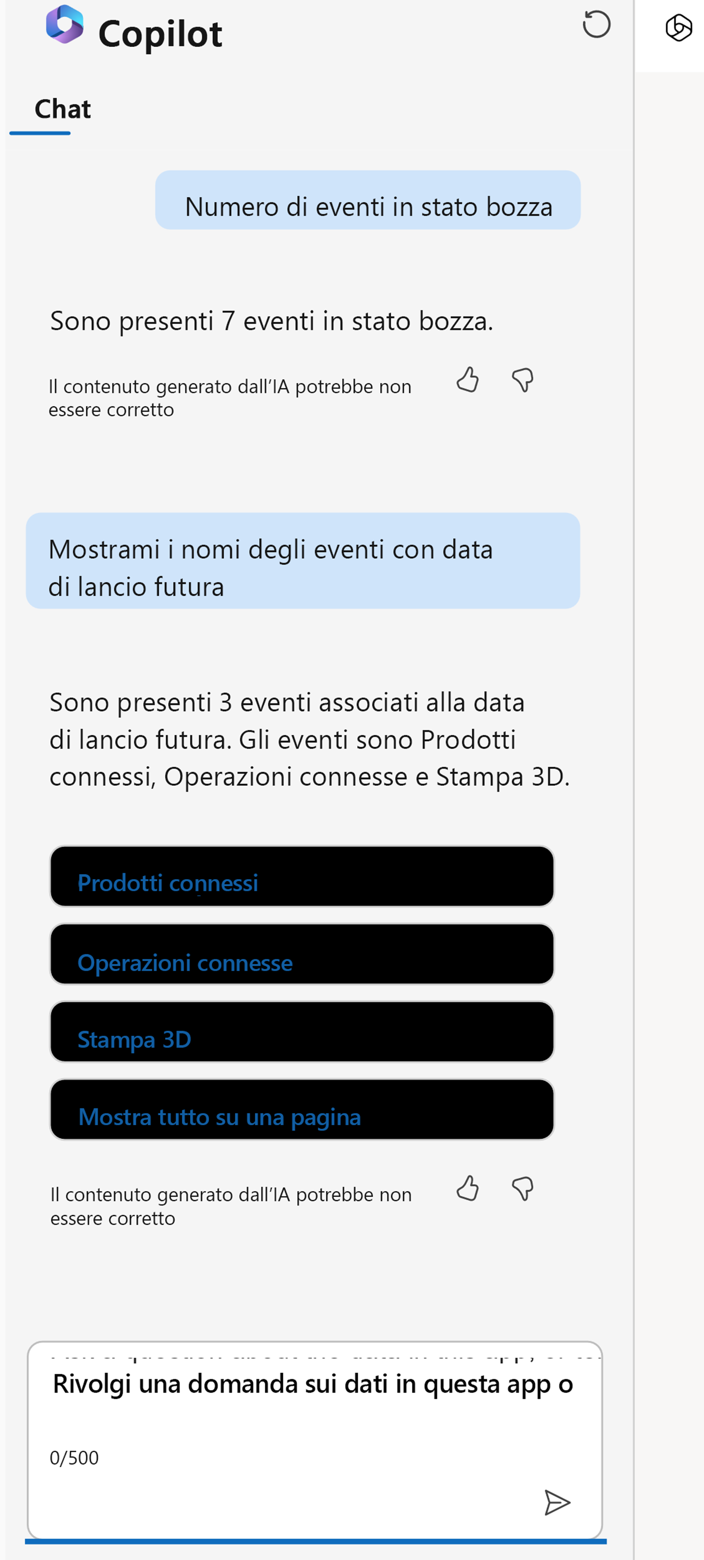Nel riquadro Copilot visualizzato, porre domande sui dati nella tabella.