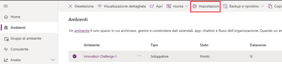 Andare all'interfaccia di amministrazione di Power Platform, selezionare Gestisci, quindi Ambienti. (Questa opzione potrebbe essere già selezionata.) Scegliere l'ambiente da usare per questo esercizio, quindi selezionare Impostazioni.