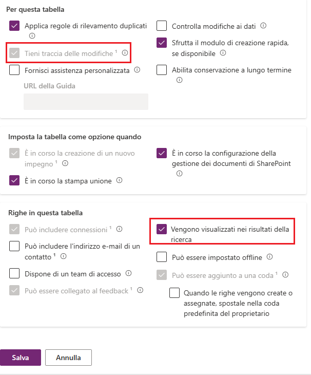 Selezionare le caselle di controllo per Registra modifiche e Viene visualizzata nei risultati della ricerca.