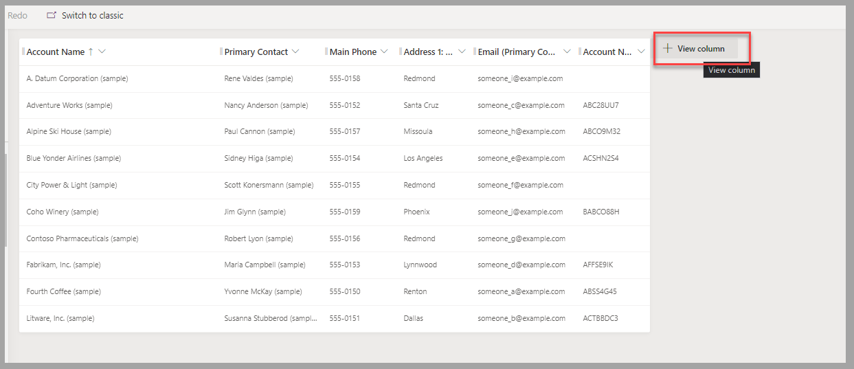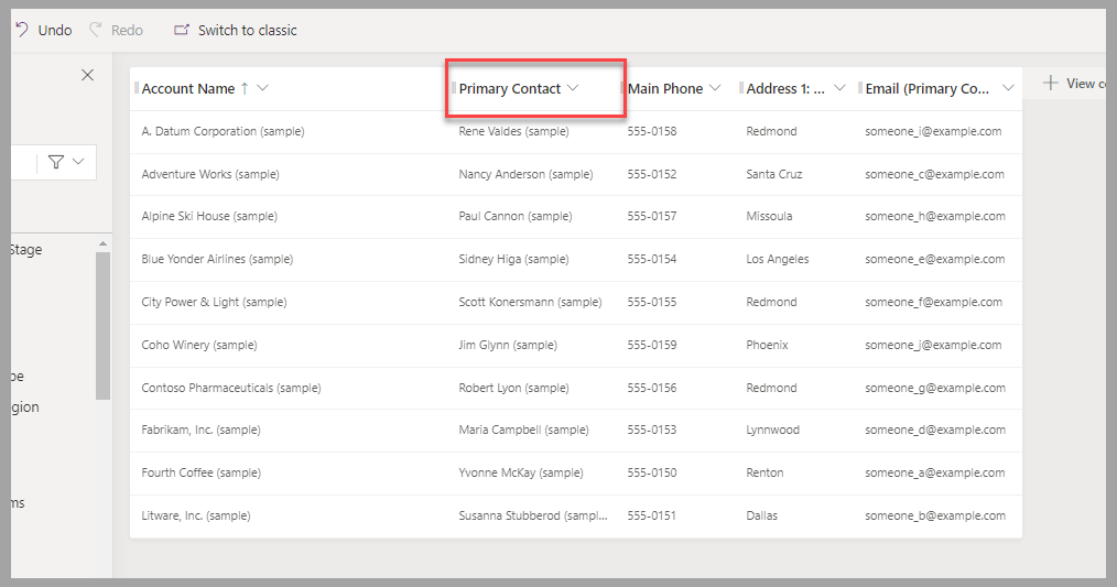 Spostare la colonna Contatto primario accanto alla colonna Nome account.