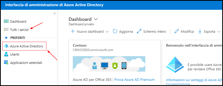 Una volta effettuato l'accesso, è possibile selezionare Microsoft Entra ID dal menu dei servizi a sinistra. Se l'opzione non è presente, selezionare la voce Tutti i servizi per avere una panoramica di tutti i servizi Microsoft Entra ID disponibili nel portale e selezionare Microsoft Entra ID dall'elenco.