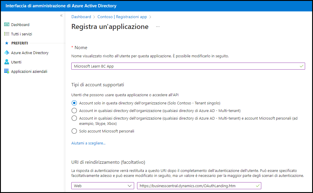 Selezionare il pulsante +Nuova registrazione per avviare la registrazione di una nuova applicazione. Fornire un nome descrittivo per l'applicazione, selezionare Account solo in questa directory organizzativa (solo NomeSocietà - Tenant singolo), quindi selezionare Web come piattaforma e https://businesscentral.dynamics.com/OAuthLanding.htm come URI di reindirizzamento. Selezionare Registra per avviare la registrazione.