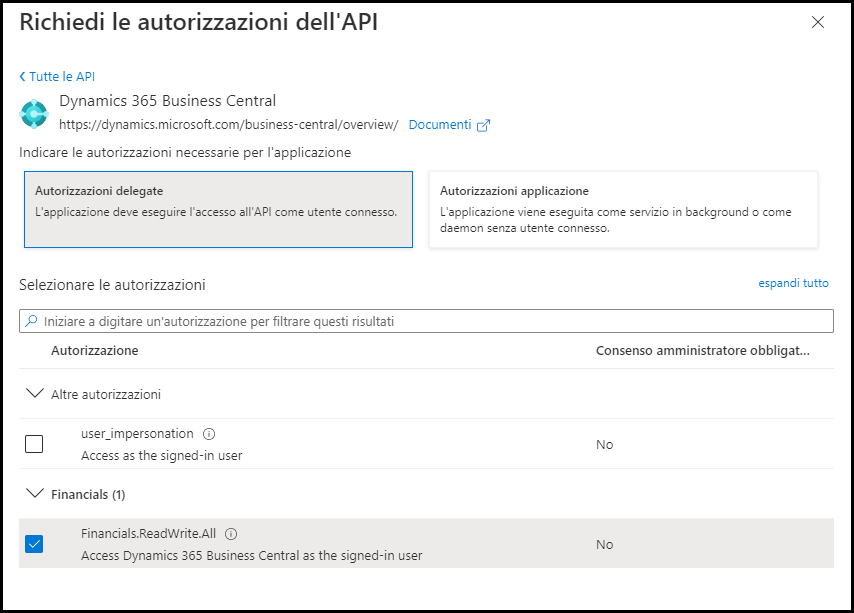 https://api.businesscentral.dynamics.com/Financials.ReadWrite.All, mentre per le autorizzazioni dell'applicazione èhttps://api.businesscentral.dynamics.com/.default.