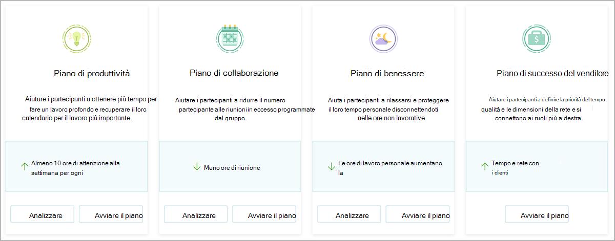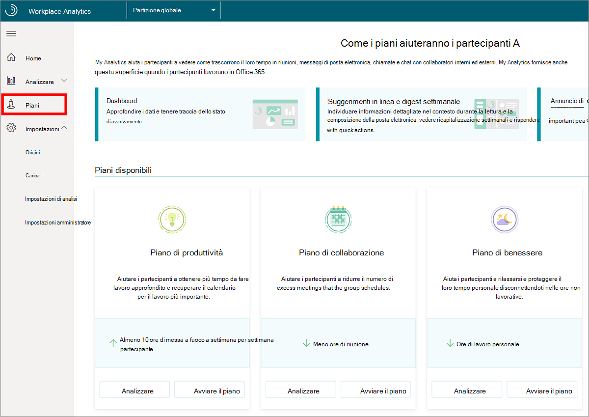 Se si ha il ruolo analista, analista limitato o program manager, è possibile aprire Workplace Analytics e selezionare Piani>Nuovo Piano. Qui sono disponibili informazioni sui tipi di piano che è possibile creare.