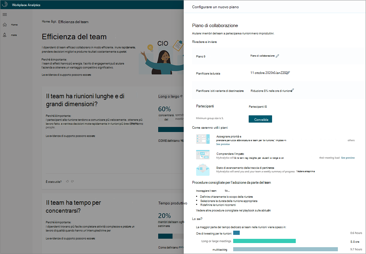 È possibile utilizzare la funzione Piani in Workplace Analytics per creare piani di miglioramento per i dipendenti, con l'obiettivo di cambiare in meglio le loro abitudini di lavoro. Usando la funzionalità Piani, è possibile: