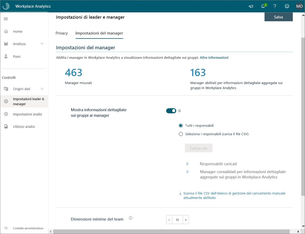 Abilitare le informazioni dettagliate su team e gruppi : gli amministratori di Workplace Analytics possono assegnare ruoli di manager nelle impostazioni di Leader e Manager.