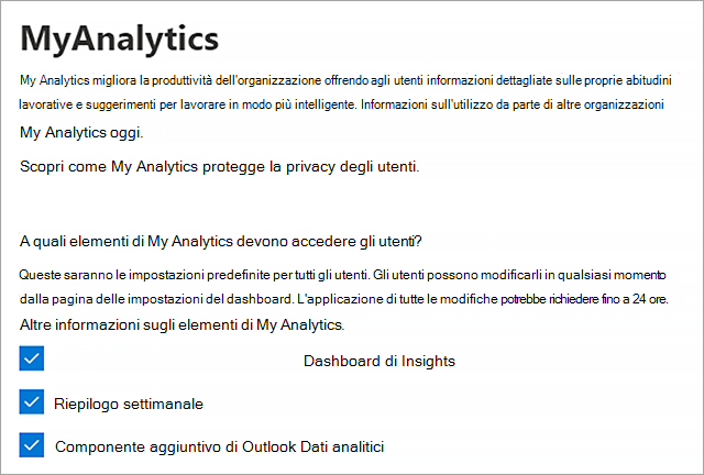 - Informazioni dettagliate personali: abilitare informazioni dettagliate personali tramite app Viva Insights, ad esempio l'app Viva Insights in Teams, il componente aggiuntivo Viva Insights Outlook e i digest mensili.