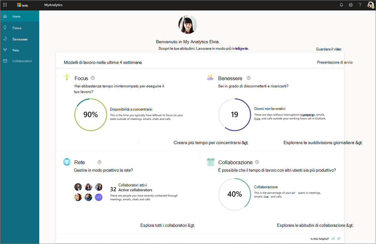 I responsabili possono accedere alle informazioni dettagliate personali tramite le app Viva Insights, ad esempio il dashboard MyAnalytics o l'app Viva Insights in Teams per visualizzare le statistiche sui modelli di lavoro nell'ultimo mese. Le statistiche includono il loro tempo di concentrazione e collaborazione, quanti giorni sono stati in grado di disconnettersi dal lavoro, e quanto efficacemente stanno facendo rete con i loro colleghi.
