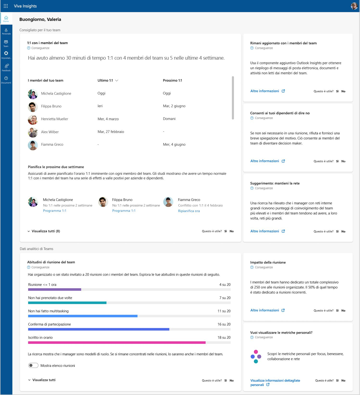 Le informazioni disponibili nel Viva Insights sono private e le metriche personali sono disponibili solo per l'accesso individuale. I responsabili avranno bisogno di una licenza di Microsoft 365 supportata per accedere a Viva Insights.