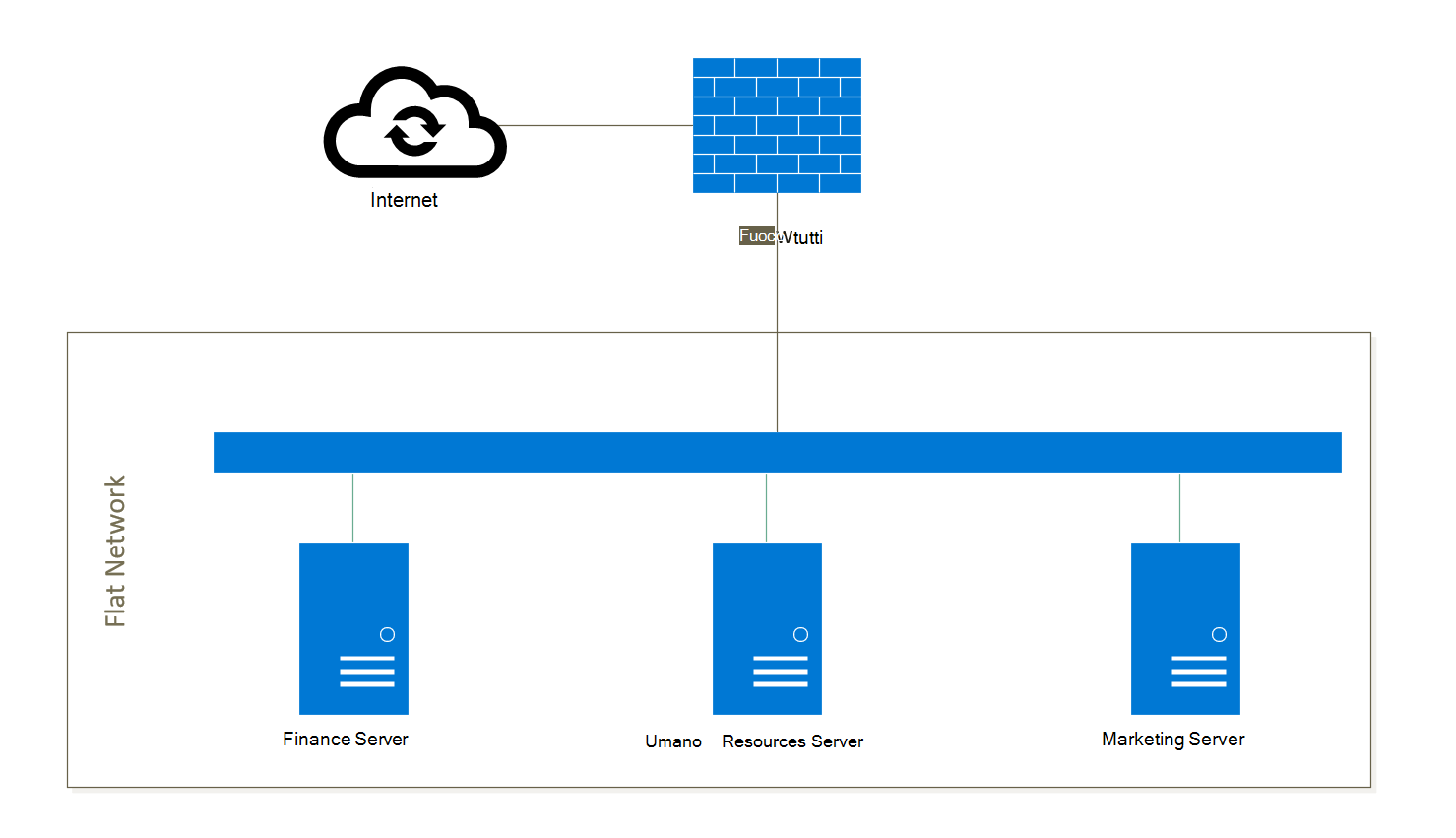 Il diagramma seguente mostra un rendering semplificato di una rete flat. Quando un utente malintenzionato accede alla rete, può andare ovunque.
