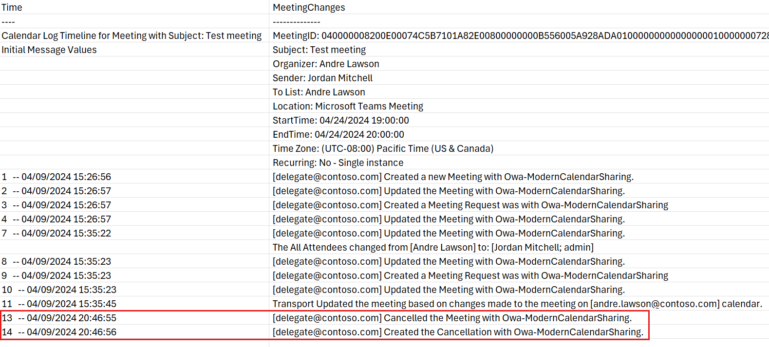 Si consideri, ad esempio, uno scenario in cui si vuole apprendere chi ha annullato una riunione. Nello screenshot seguente, il foglio di lavoro della sequenza temporale per un delegato mostra che il delegato ha annullato la riunione in Outlook sul web.