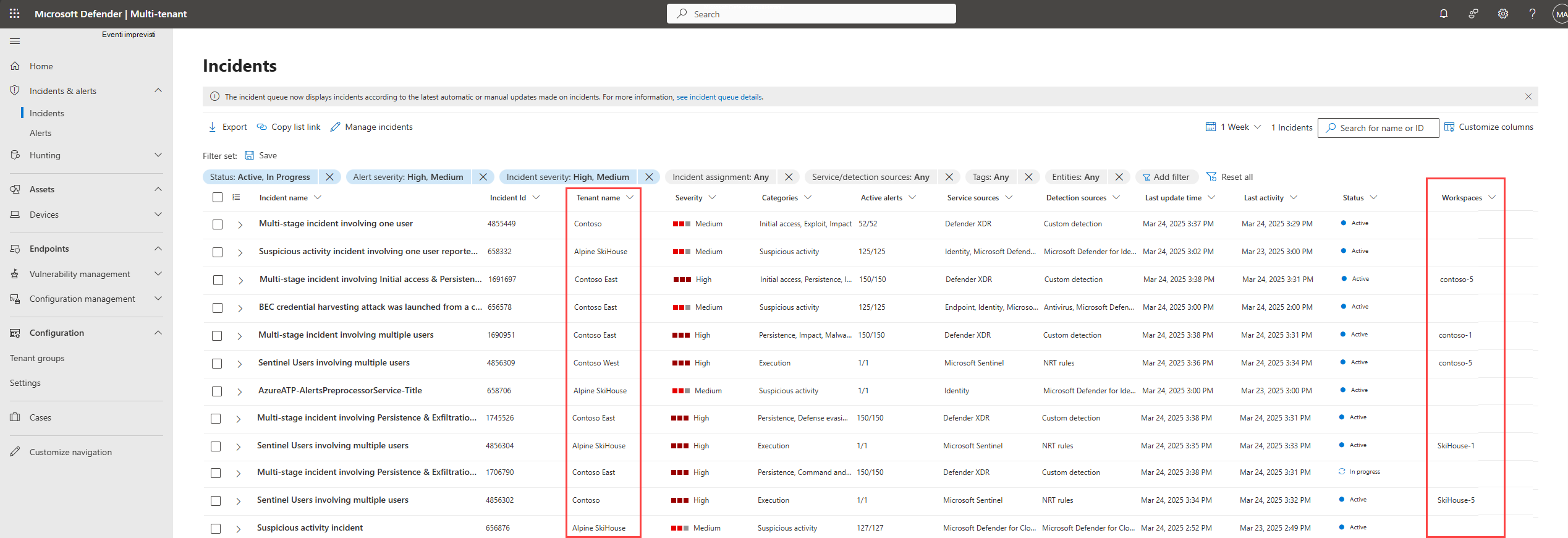 Passare alla pagina Eventi imprevisti in Microsoft Defender gestione multi-tenant. Le colonne Nome tenant e Aree di lavoro mostrano da quale tenant proviene l'evento imprevisto: