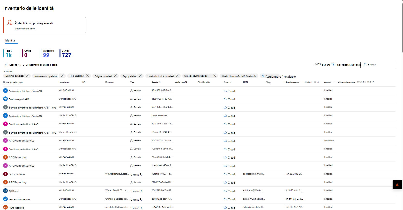 La pagina Identità nella gestione multi-tenant consente di gestire rapidamente tenant e identità.