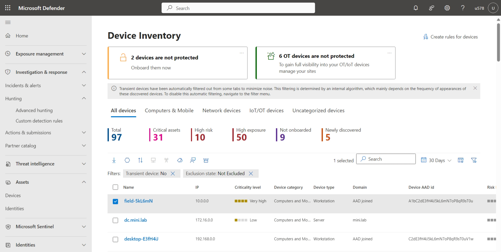 | Dispositivi | Nella pagina Inventario dispositivi ottenere una panoramica dei dispositivi individuati in ogni tenant a cui si ha accesso. Esaminare i dispositivi per tipo e concentrarsi su dispositivi ad alto rischio o critici. Raggruppare i dispositivi in modo logico aggiungendo tag per il contesto ed escludere i dispositivi che non si desidera valutare. Avviare un'indagine automatizzata per i dispositivi. |